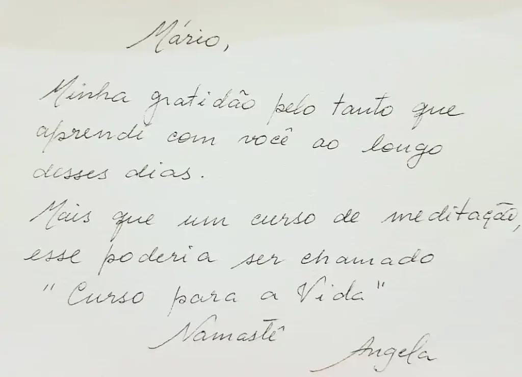A meditação na minha vida me trouxe mais consciência e ponderação de meus atos . Sou muito grata ao professor Mário por compartilhar todo esse conhecimento com sabedoria e desprendimento.